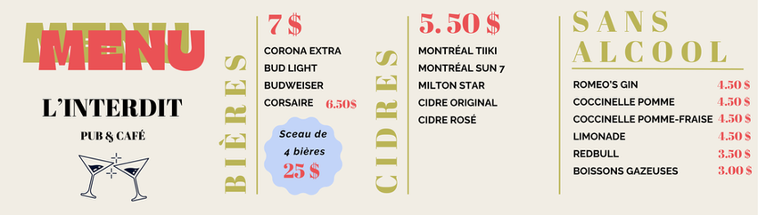 * Les heures peuvent changer selon les évènements qui se dérouleront au Pub L'Interdit *